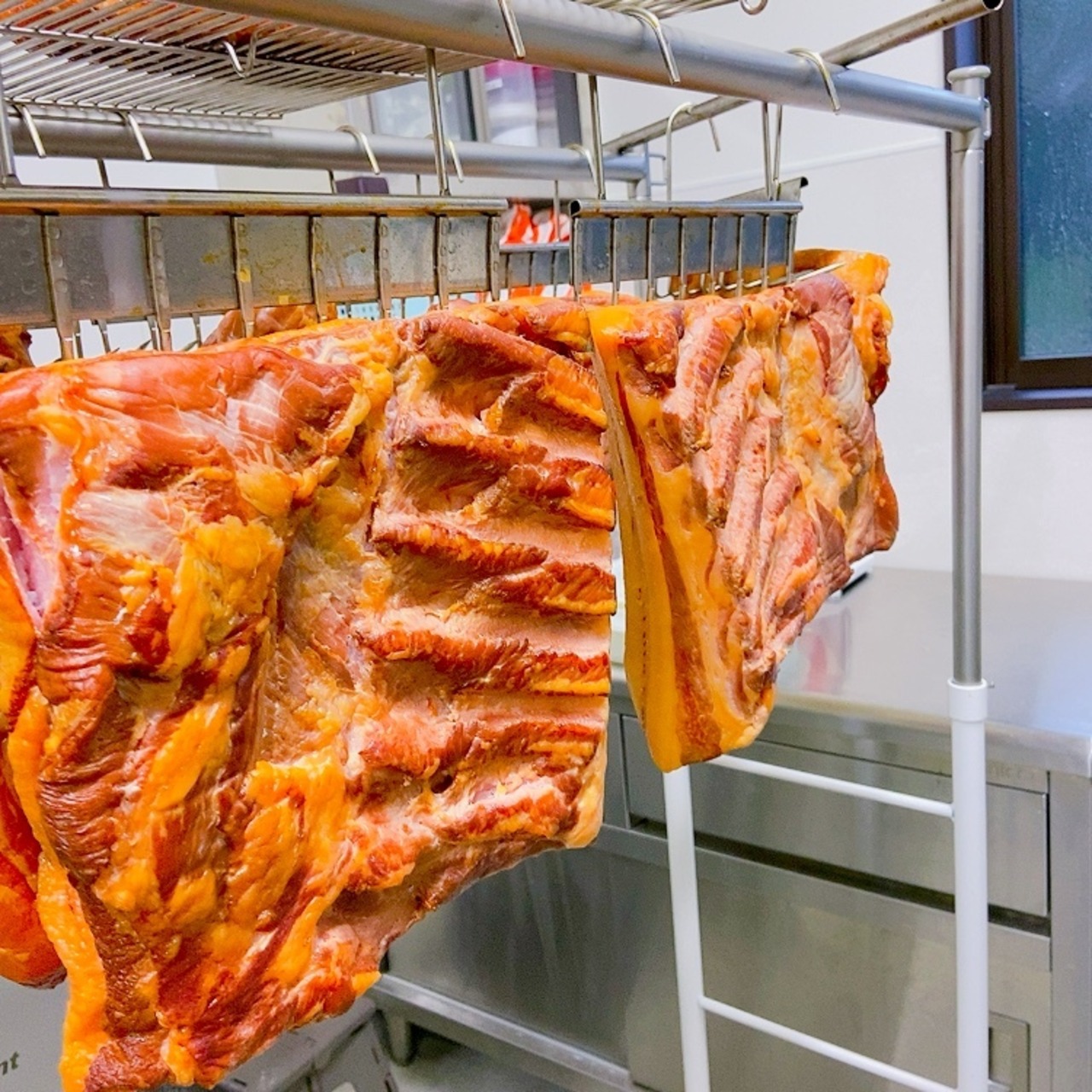 榛名ポークのバラ肉を2週間熟成して、スモークしています。